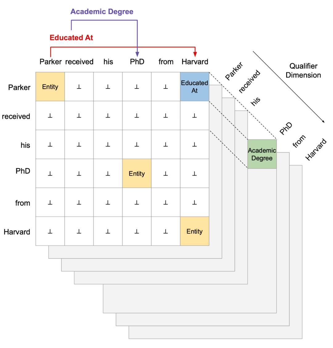 例如,“Educated At” 表示了头部实体 “Parker” 和尾部实体“Harvard” 之间的关系。立方体的后面平面代表限定信息,对应关系三元组的可能限定信息的类别和实体词。例如,“PhD” 的限定平面中的条目“Academic Degree” 对应于关系三元组(Parker,Educated At,Harvard),形成了超关系事实(Parker,Educated At,Harvard,Academic Degree,PhD)。
