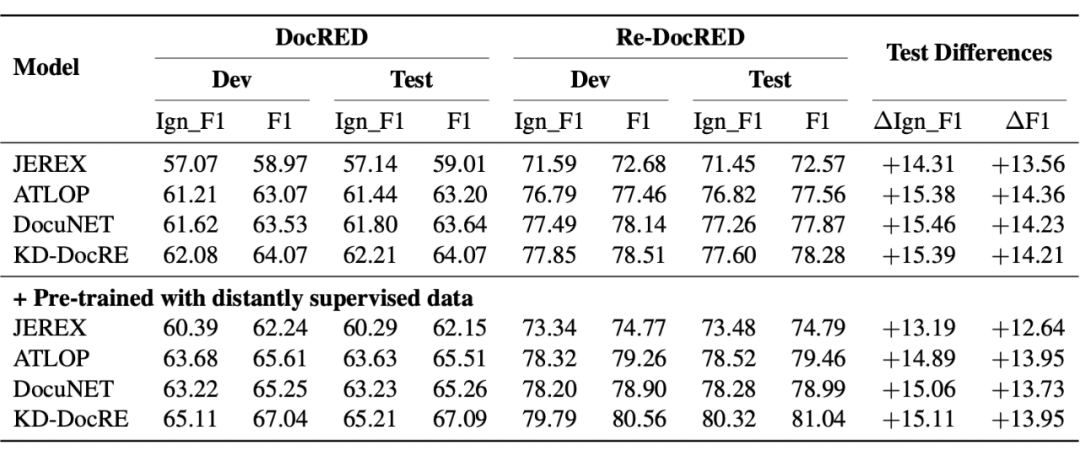 我们在不同模型上对 Re-DocRED 进行了实验,在上小节提到的三个模型(KD-DocRE, DocUNET, ATLOP)之外,还在 JEREX