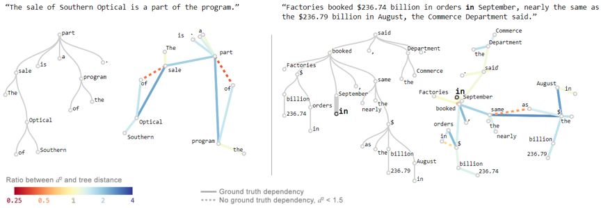 近段时间,一个激动人心的发现带来了一种全新类型的表征方式。关于一个句子的语言信息中,一大关键部分是其句法结构。这种结构可以表示成树,其节点对应于句子的词。Hewitt 和 Manning 在论文《A Structural Probe for Finding Syntax in Word Representations》中表明某些语言处理网络能够构建这种句法树的几何副本。词是通过在一个高维空间的位置给定的,而(遵照一定的变换)这些位置之间的欧几里德距离映射了树距离。