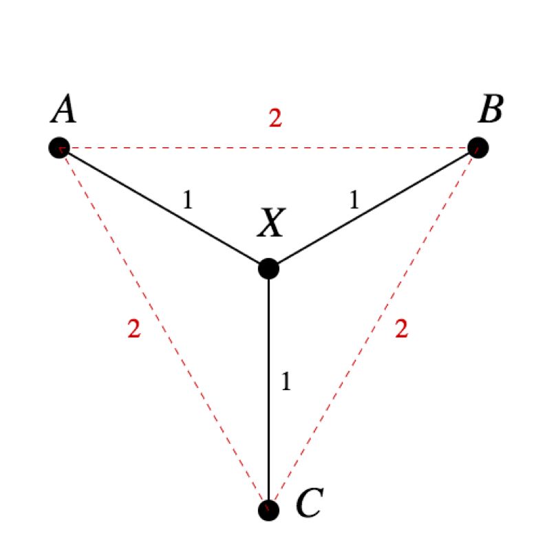 事实上,图 1 中的树就是一个标准示例,表明并非所有度量空间都可以等距离地嵌入到 R^n 中。因为 d(A,B)=d(A,X)+d(X,B),所以在任意嵌入中 A、X 和 B 都是共线的。基于同一逻辑,A、X 和 C 也是共线的。但这就意味着 B=C,这是矛盾的。