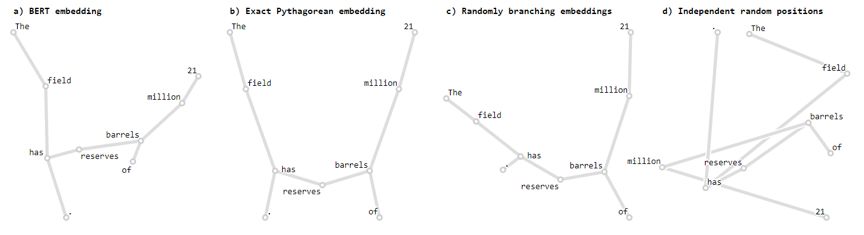 图 5:PCA 视图。a)BERT 解析树嵌入。b)精确毕达哥拉斯嵌入。c)不同的随机分支嵌入。d)节点位置是随机地独立选择的不同嵌入。该图的交互式版本请访问原文。