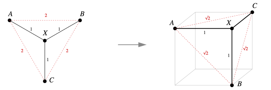 我们也可以对定理 1.1 进行略微的泛化。考虑边有权重的树,两个节点之间的距离是它们之间的最短路径上边的权重的和。在这种情况下,我们也总是可以创建毕达哥拉斯嵌入。