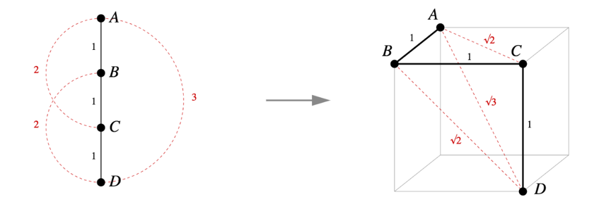 图 3:四个顶点构成的链也有在单位正方体的顶点上的毕达哥拉斯嵌入