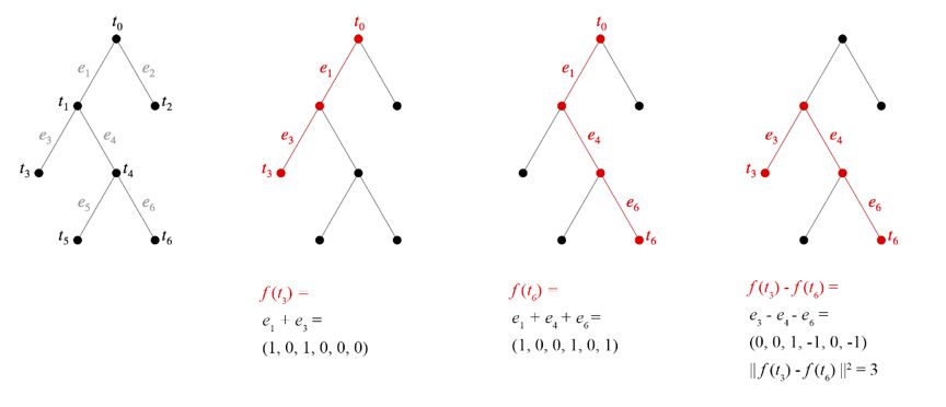 图 4:左:将基向量分配给边。中:两个示例嵌入。右:平方的距离等于树距离。