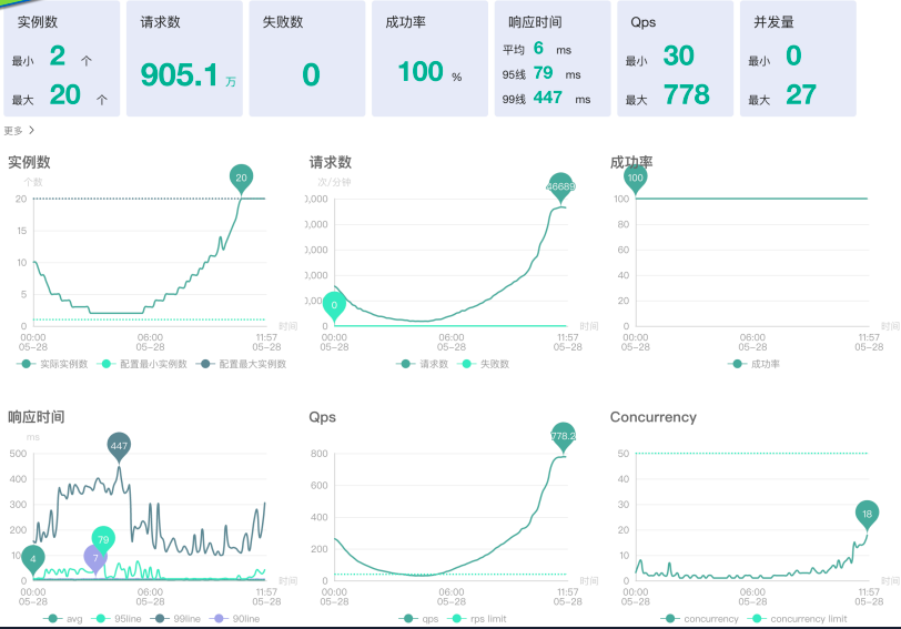 上方曲线为请求指标,下方曲线为扩缩决策指标。两曲线相互对应,即实现了配合业务流量扩缩容。