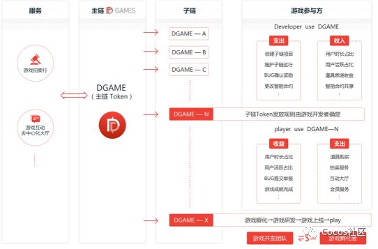 DGAMES为每个项目提供一条独立的子链,同时提供部分最基础的智能合约。开发者可以自行决定子链Token的发放方式。开发者可以自行编写智能合约,也可以将自己独有的智能合约提交给公用的智能合约库供其他开发者使用,最早提供的开发者可以从后续使用该智能合约的开发者那里获取收益。