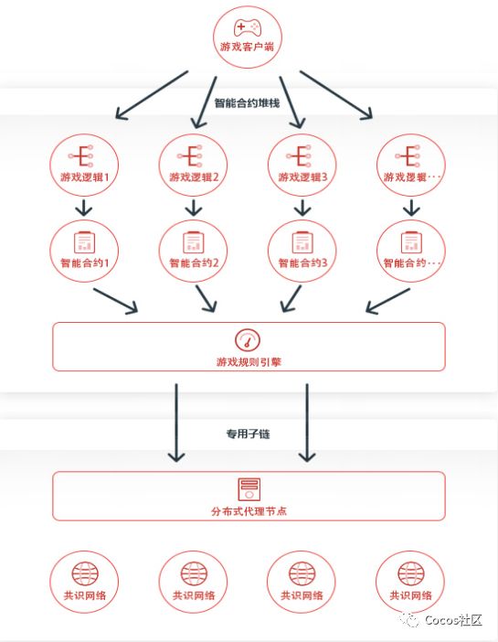 游戏规则引擎直接与链结构交互,是极为重要的核心模块。智能合约代码本质上是为了对游戏上层业务逻辑进行支持。