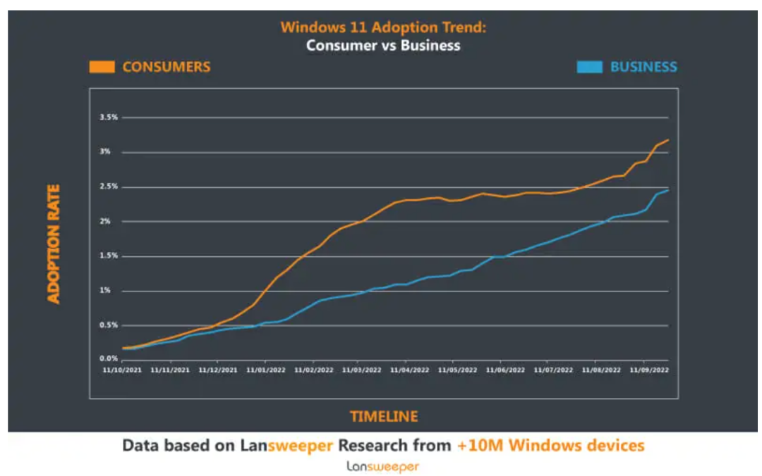 近日,资产管理服务商 Lansweeper 最新发布的一份关于企业使用 Windows 11 的最新报告便揭示了其中的真相。