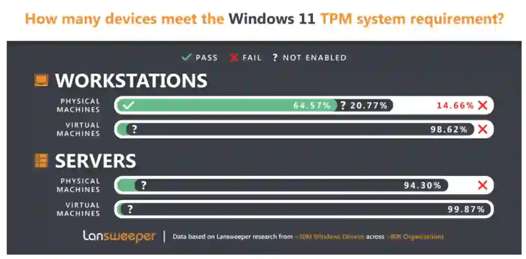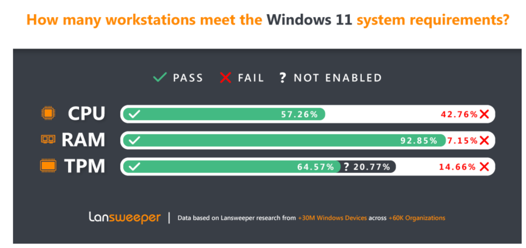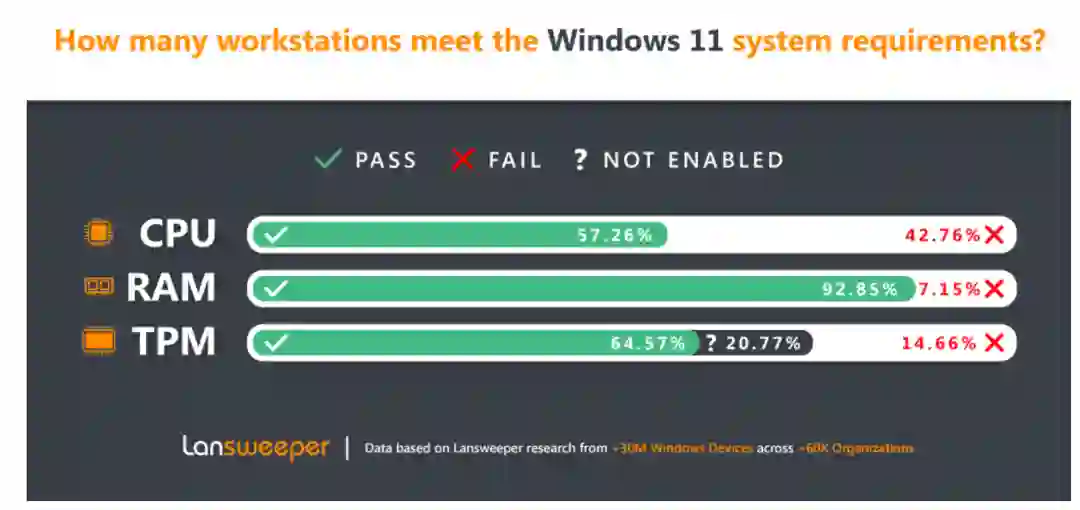根据资产管理服务商 Lansweeper 调查了分布在 60,000 家公司中的大约 3000 万台 Windows 设备的样本发现,平均而言,只有 57.26% 的 PC 才有资格获得 Windows 11 的自动升级更新,超四成的设备都没有资格。
