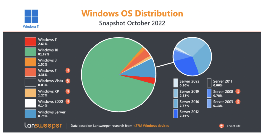 另一边,Lansweeper 也做了调查,Windows 11 的用户量自 2022 年 4 月至今,只上涨了 1.17%,占比 2.61%。就目前而言,占比 81.87% 的 Windows 10 是最受欢迎的,遥遥领先。