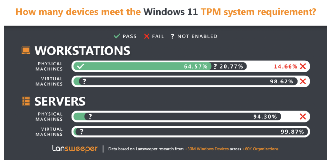 物理服务器上的 TPM 只有 2.35% 通过了测试。这意味着如果微软在未来创建一个具有类似要求的服务器操作系统,大约 97% 的人将无法升级。对于虚拟服务器,同样几乎没有支持 TPM 的服务器。