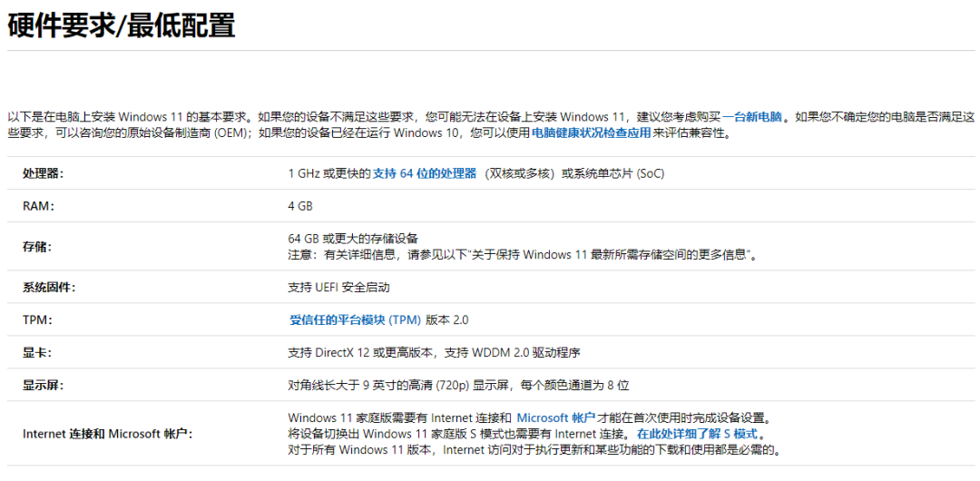 事实上,Windows 11 自官宣的一年多以来,业界关于微软对新系统设置的门槛争议就未曾断过。在 Windows 11 中,微软要求安装该系统的硬件最低配置必须要满足以下三个重点层面: