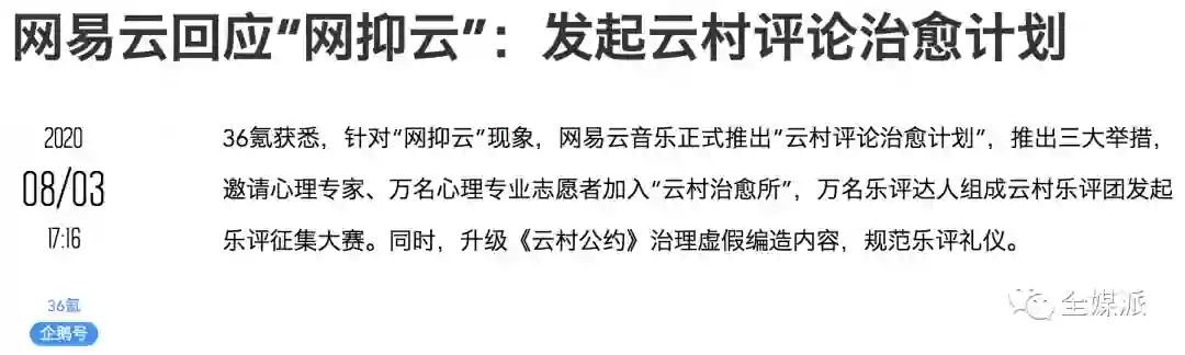 针对这一现象及网上的讨论,8月3日,网易云音乐特别推出“云村评论治愈计划”,邀请心理专家、心理专业志愿者加入“云村治愈所”。