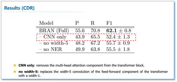 我们关注一下attention这部分的实验结果。他们在生物医学药物致病数据集上(Chemical Disease Relations,CDR)取得了先进结果。去掉self-attention这层以后可以看到结果大幅度下降,而且使用窗口大小为5的CNN比原始的FNN在这个数据集上有更突出的表现。