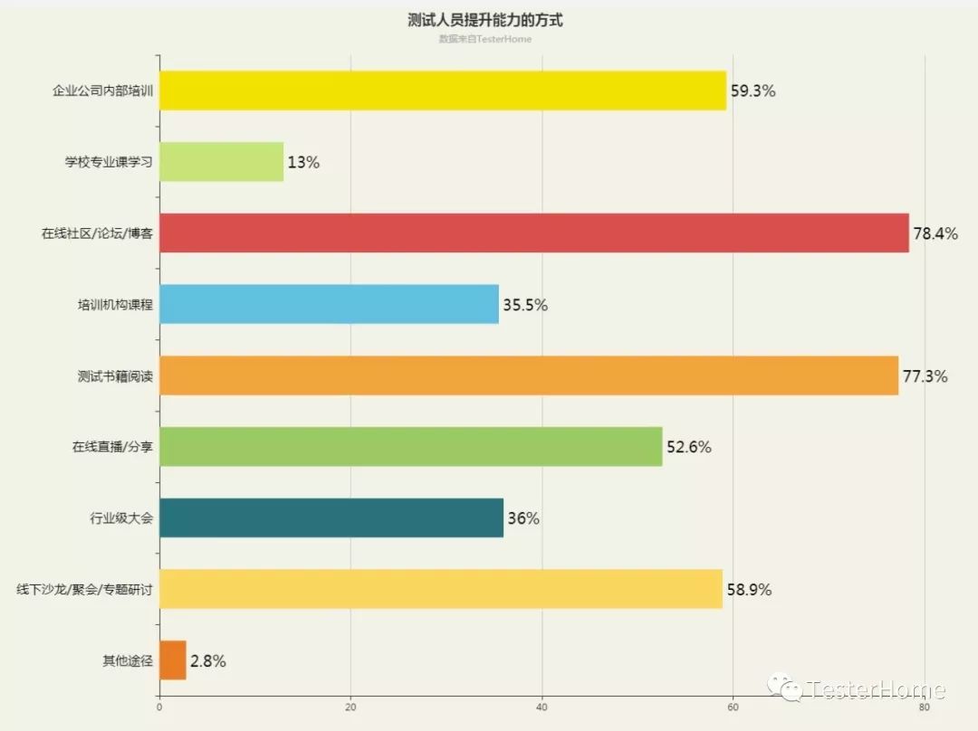来了解一下测试同行们都是如何提升自己能力的吧。“社区论坛博客”和“测试书籍阅读”这两项排名靠前,欢迎多来社区发帖讨论,也多多参加社区组织的线下沙龙和技术聚会,共同学习互动。