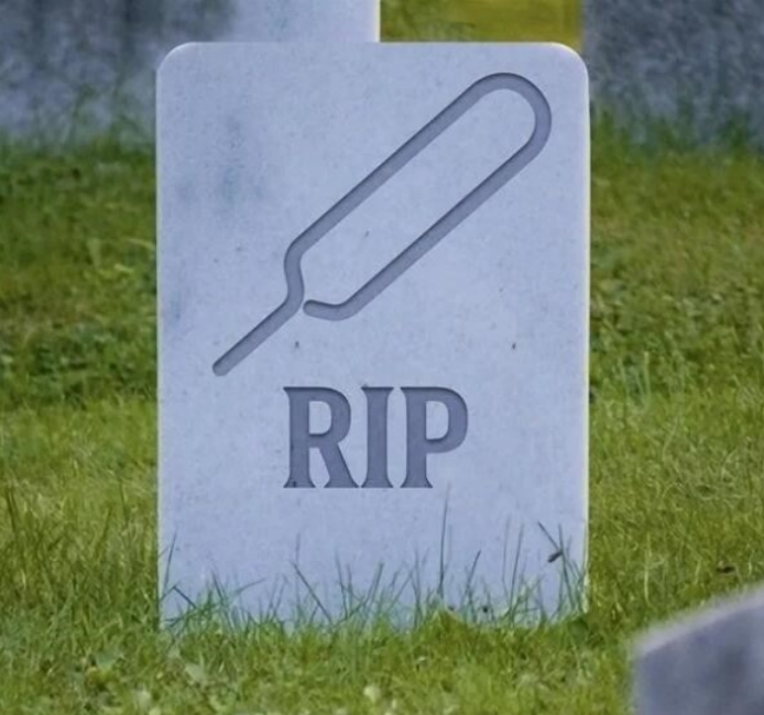 最新一款火遍全网的墓碑,立在苹果发布会之后,碑上是那根你永远都在弄丢、苹果官网标价60元的SIM卡针。
