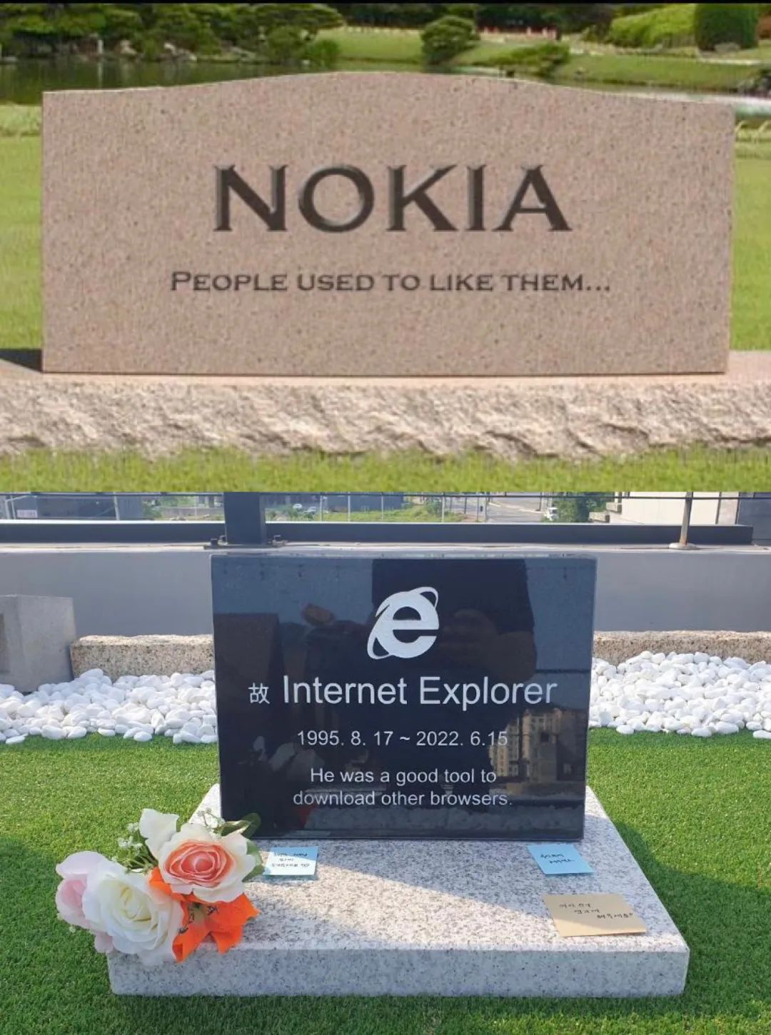 当年微软收购诺基亚,各种赛博墓碑在网上疯传:爱过,走好。IE浏览器彻底退休后,一位韩国码农在咖啡馆屋顶上给IE刻了块真墓碑,墓志铭更加缺德:它是下载其他浏览器的好工具。