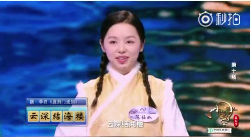 4月4日总决赛。陈珏如在回答第一题《渡荆门送别》时,将“云生结海楼”答成了“云深结海楼”,一字之差,首轮就被淘汰。