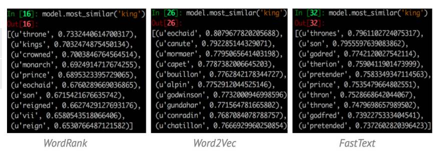 图1. WordRank, Word2Vec和FastText三种模型输出与"king"最相似的词