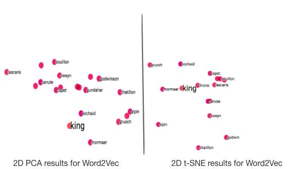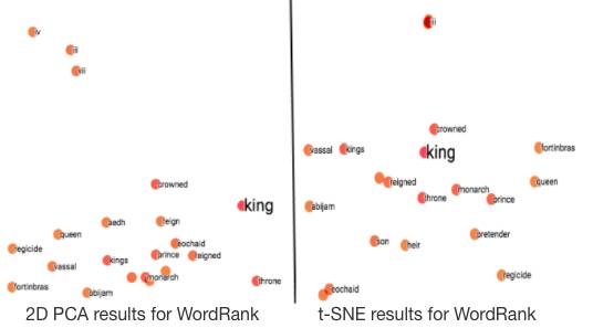 从图3可以看出,在Word2Vec模型中,两种方法都表现不错。要注意的是,由于t-SNE是一种随机方法,所以即使是使用相同的参数设置,也可能得到不同结果。在FastText中,两种方法表现相似,稍次于Word2Vec。在WordRank模型上 ,t-SNE方法效果好于PCA,因为在PCA方法中,一些最相似的词反而在图中被置于较远的位置。