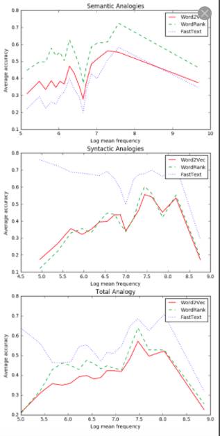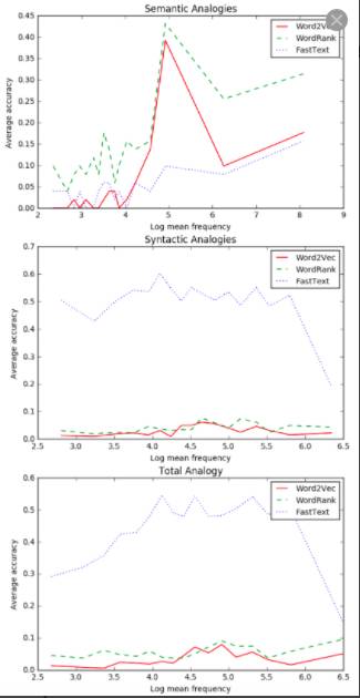 2.在语法类比中,FastText优于Word2Vec和WordRank 。FastText模型在低频词语上表现的相当好,但是当词频升高时,准确率迅速降低,而WordRank和Word2Vec在很少出现和很频繁出现的词语上准确率较低;