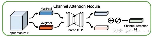 同时使用average-pooling和max-pooling聚合空间维度特征,产生两个空间维度描述符。随后经MLP(fc+Relu+fc)+sigmoid层(和SE-Net相同,只是squeeze操作多了一步max pooling),为每个通道产生权重,最后将权重与原始未经channel attention相乘。