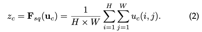 Squeeze 使用全局平均池化(也可用其他方式)生成通道信息统计,实现通道描述;