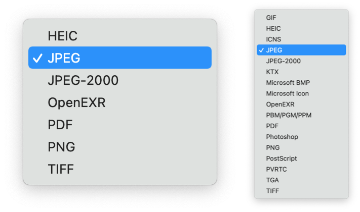 按 Option 键前后对比:左侧为未按,右侧按 Option 键后出现了更多的可保存格式