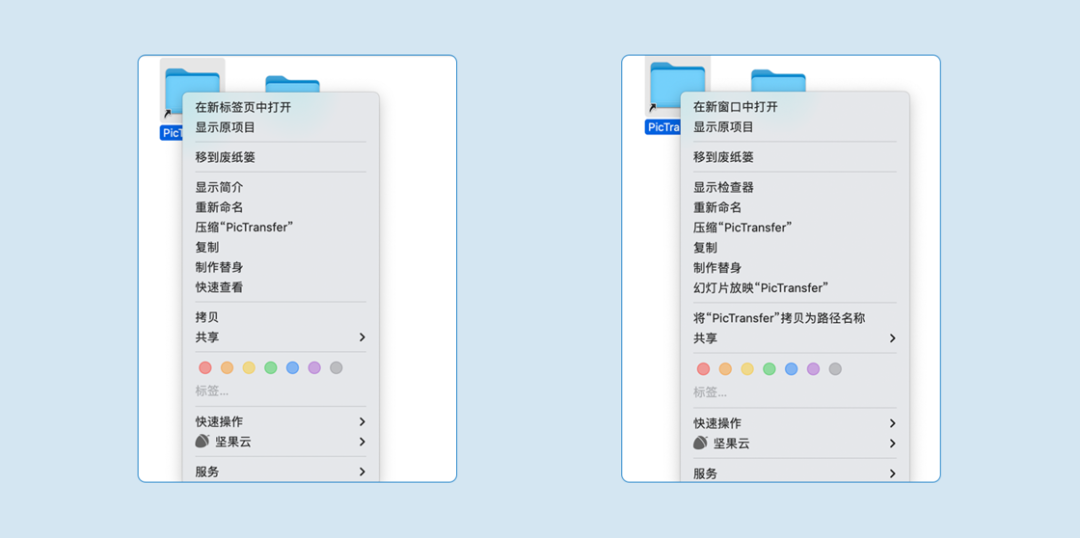 右键对比,左侧为未按 Option 键,右侧为按 Option 键