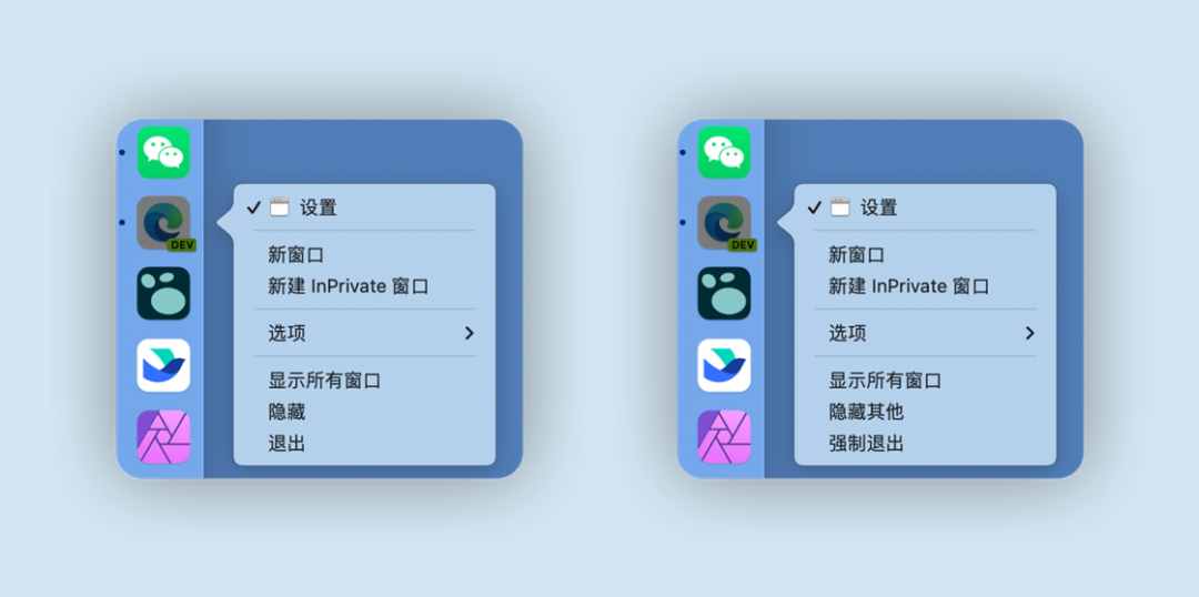 按 Option 键前后对比:左侧为未按,右侧按 Option 键后出现「强制退出」