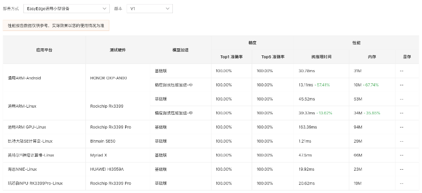 一次训练,多端部署。一个模型可以发布这么多的部署包,省去了一个个适配的麻烦。在这个页面上还最新上线了模型效果评估的功能,打开性能评估报告,便能看到下面这样的页面。模型的精度、对应硬件上的推理时间都一目了然的展示出来了(tips:这里的推理时间可不是经验时间,是你的模型真实在硬件跑出来的时间哦),有个这个报告,大家在部署前就能对自己的模型精度和性能情况了然于胸,是不是很贴心呢?