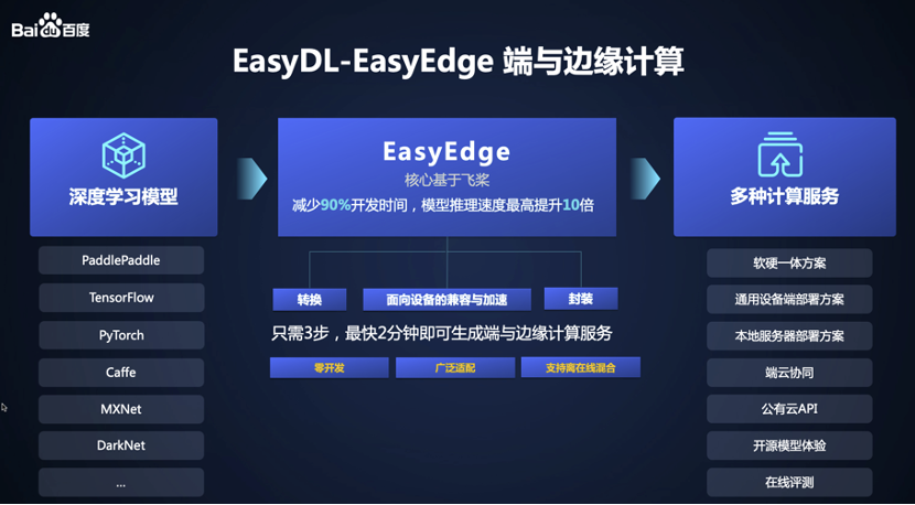 当下,飞桨PaddlePaddle、TensorFlow、PyTorch这样的开源框架已经非常强大,为部署侧也提供了相关的开源组件,以求降低开发难度。但由于端侧硬件、系统种类繁多,各种加速芯片层出不穷,端侧部署开发工作仍存在实实在在的挑战,成为开发者将AI模型真正用起来的“拦路虎”。面对这些问题,是否存在一个平台,能够缩短部署开发的时间,实现一键式部署?同时对模型进行压缩提速,实现高性能推理?百度EasyEdge专为解决以上问题而生,EasyEdge以PaddleLite、PaddleSlim为基础,提供了简单易用的端上部署套件,实现不写代码直接部署模型到端侧,并支持二次开发。另外,EasyEdge也扩展了对主流端计算硬件的支持,适配更广泛的硬件平台、操作系统、模型类型,并针对特定加速芯片使用专有的计算库,实现进一步的性能提升。