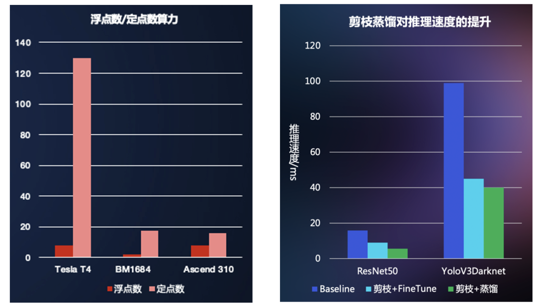 为了让模型跑得更快更省内存,模型压缩就是推理侧非常强大且实用的技术了。这方面,EasyEdge不仅支持了业界领先的量化、剪枝和蒸馏技术,还能够混合使用这几项能力,在尽可能保证效果的同时达到更好的压缩效果。左下图展示了几款常见硬件的定点数算力和浮点数算力的比对,可以看到在很多硬件上定点数算力都远大于浮点数算力,对于这样的硬件,量化是非常必要的。而右图中则可以看到剪枝和蒸馏对于模型推理的加速效果,剪枝和蒸馏本质都是对基础模型在尽量不影响精度的前提下进行精简,自然模型小了,内存占用就少了,推理时间也就短了。