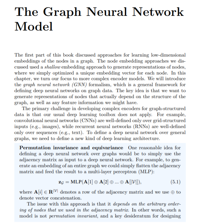 在本章中,我们将关注更复杂的编码器模型。我们将介绍图神经网络(GNN)的形式,它是定义图数据上的深度神经网络的一般框架。关键思想是,我们想要生成实际上依赖于图结构的节点的表示,以及我们可能拥有的任何特征信息。在开发复杂的图结构数据编码器的主要挑战是,我们通常的深度学习工具箱不适用。例如,卷积神经网络(CNNs)只在网格结构的输入(如图像)上定义良好,而递归神经网络(RNNs)只在序列(如文本)上定义良好。要在一般图上定义深度神经网络,我们需要定义一种新的深度学习架构。