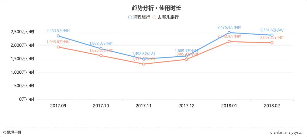 2017年9月-2018年2月携程旅行、去哪儿旅行APP使用时长趋势