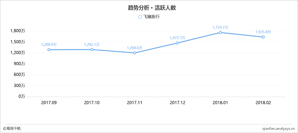 2017年9月-2018年2月飞猪旅行APP月活趋势