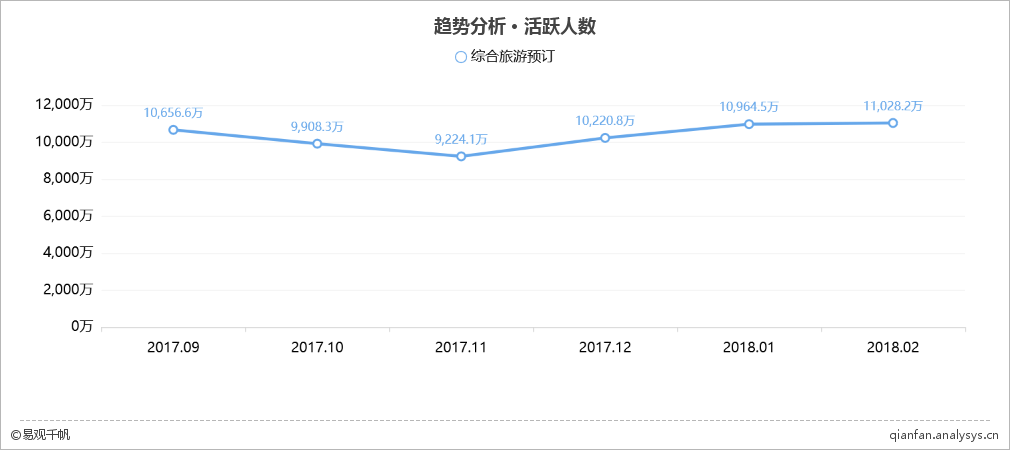 根据易观千帆数据显示,2018年2月综合旅游预订应用活跃用户规模为11028.2万,较1月有所上调。综合旅游预订应用活跃用户规模自2017年11月逐步提升,一方面,虽然第4季度进入旅游淡季,但是在寒假与春节出游的助推下,市场处于平稳增长阶段,另一方面,市场格局相对稳定,厂商们纷纷通过提升资源端控制力,升级服务和产品等手段来塑造更强大的竞争力,推动旅游产品多样化发展。