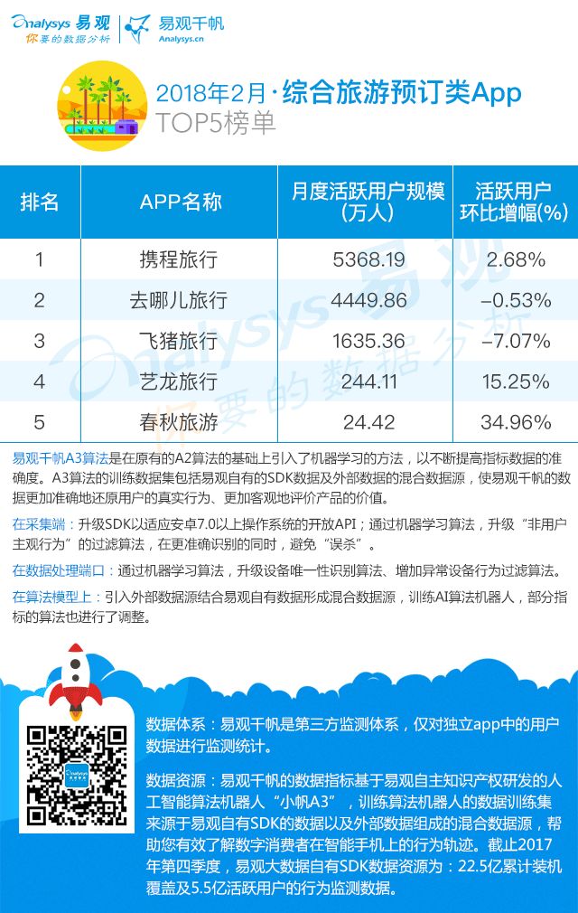 在2018年2月最新综合旅游预订APP排行榜中,携程旅行以5368.2万活跃用户排名第一,去哪儿旅行和飞猪旅行位列第二、第三。