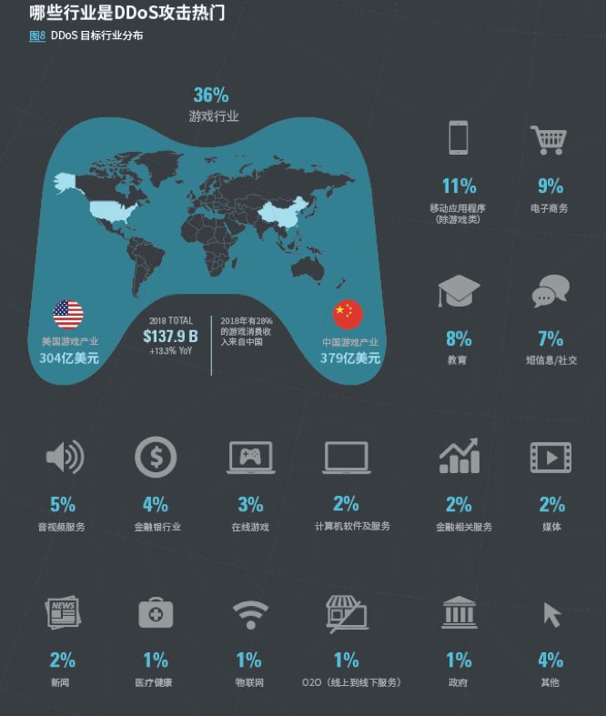 阿里云在 2018 年看到的 DDoS 攻击强度和复杂度均打破了历史记录,仅在2月份就抵御了数次Memcached攻击,峰值超过800Gbps,每秒TB级别的攻击时代已经到来。游戏、移动应用、电子商务等竞争激烈的领域成为DDoS重点攻击阵地。