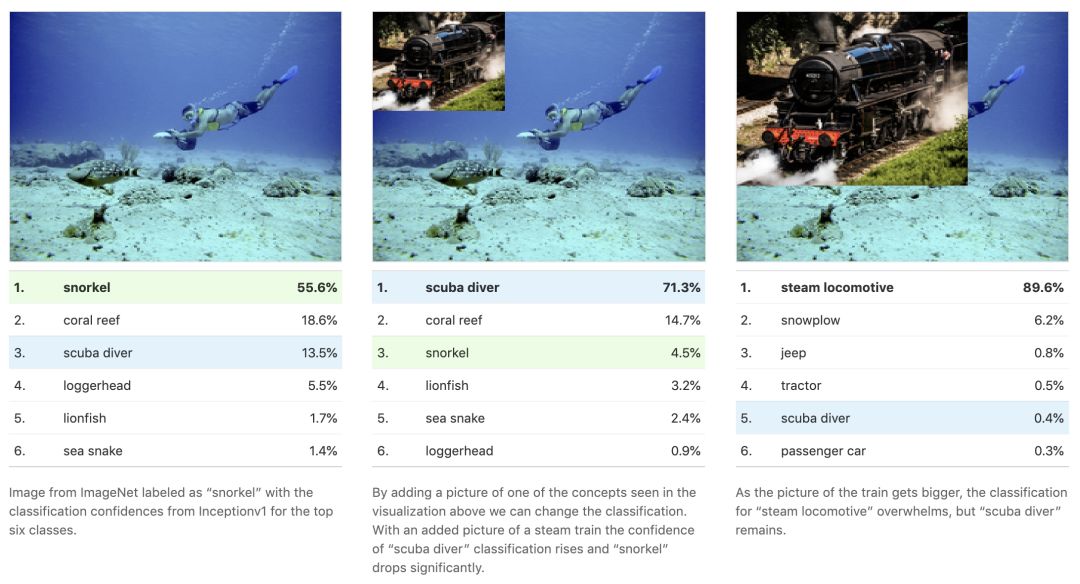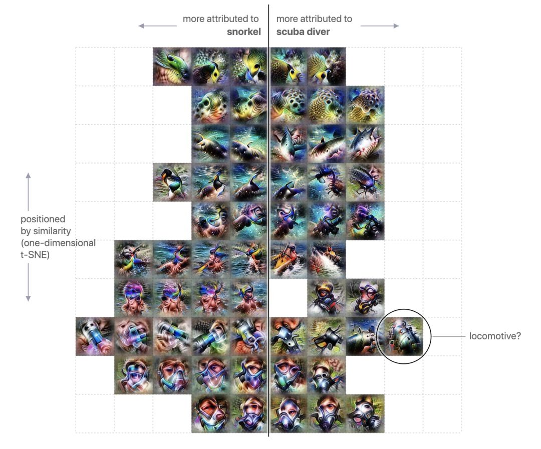 这里的失效模式似乎是该模型正在使用其探测器用于“蒸汽机车”类来识别空气罐以帮助对“潜水员”进行分类。