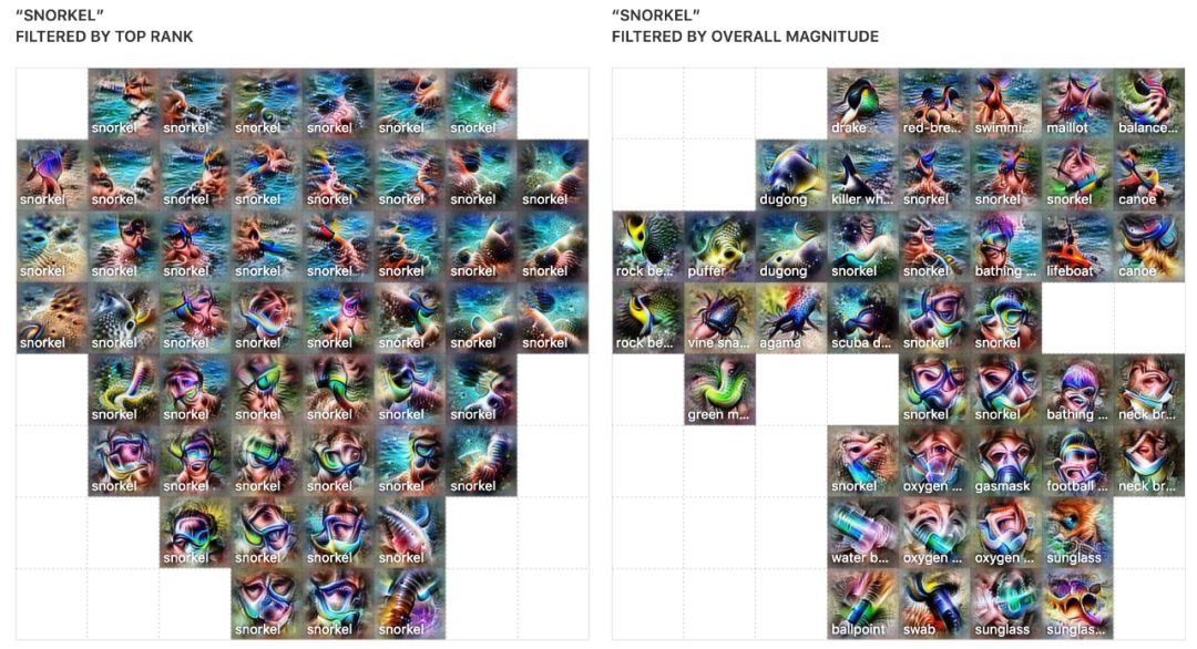 类激活图集使我们能够更清楚地了解网络使用哪些检测器对特定类进行排名。 在“呼吸管”示例中,我们可以清楚地看到海洋、水下和彩色面具。