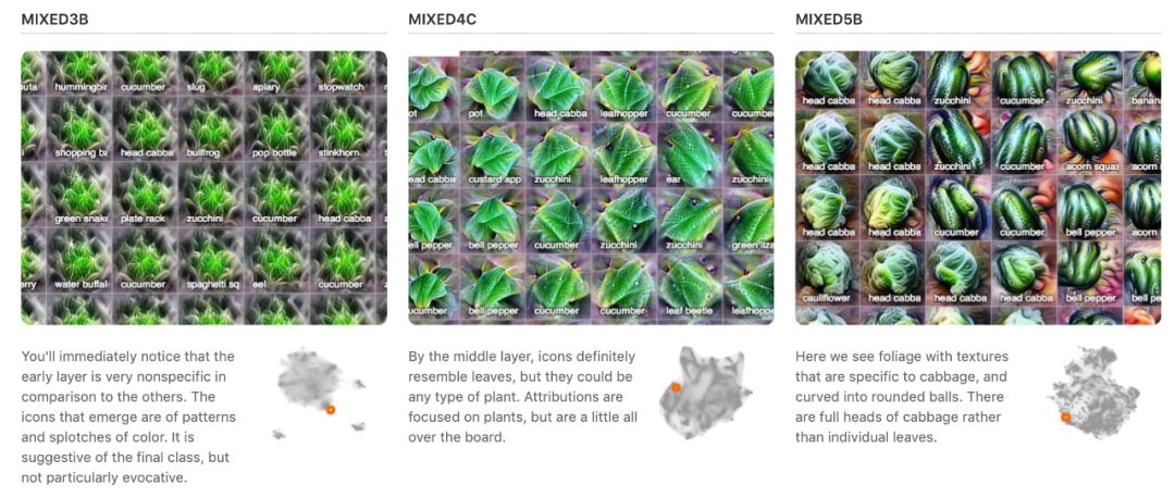 首先,让我们比较来自网络不同区域的三个层,以了解每个层的不同特征——mixed3b、mixed4c和mixed5b。我们将关注每层的有助于“卷心菜”分类的区域。