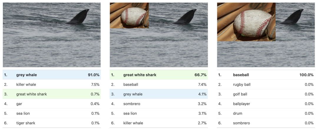 让我们将棒球图片添加到ImageNet中的“灰鲸”图片中,看看它是如何影响分类的。
