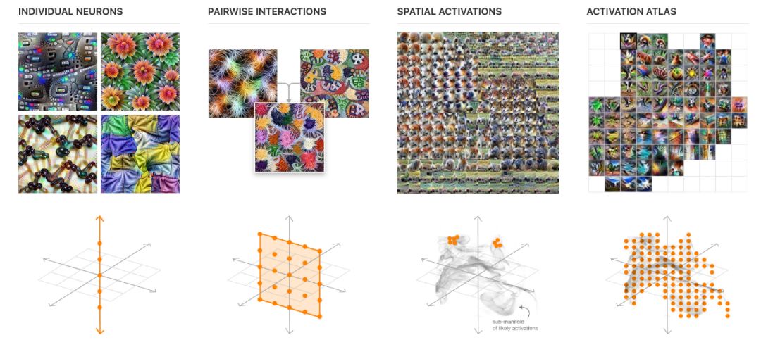 (单个神经元)单个神经元的可视化使隐藏层变得有意义,但是忽略了神经元之间的交互作用——它只向我们展示了高维激活空间的一维正交探针。(成对交互)成对的交互揭示了相互作用的效果,但它们只显示了具有数百个维度空间的二维切片,而且许多组合是不现实的。(空间激活)空间激活通过对可能激活的子流形进行采样来向我们显示许多神经元的重要组合,但它们仅限于给定示例图像中出现的那些神经元。(Activation Atlas)通过对多种可能的激活进行采样,Activation Atlase为我们提供了一个更全面的概览。