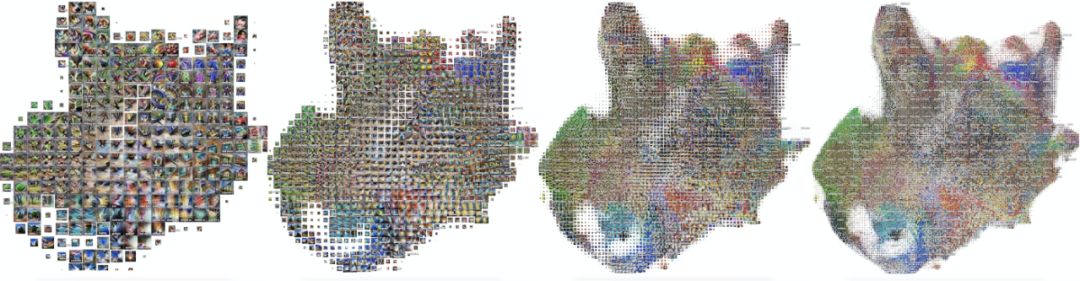 通过一些先进的降维技术,可以将收集到的激活向量投影到有用的二维布局中,并保留原始空间的一些局部结构。将在创建的2D布局上绘制网格,对于网格中的每个单元格,将位于该单元格边界内的所有激活平均化,并使用特征可视化来创建图标表示。