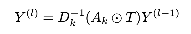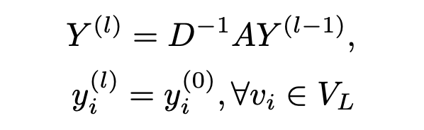 拓扑空间:经典的标签传播通常假设两个连接的节点更有可能具有相同的类,从而在邻域之间迭代地传播标签,在迭代 l 中的标签传播定义如下: