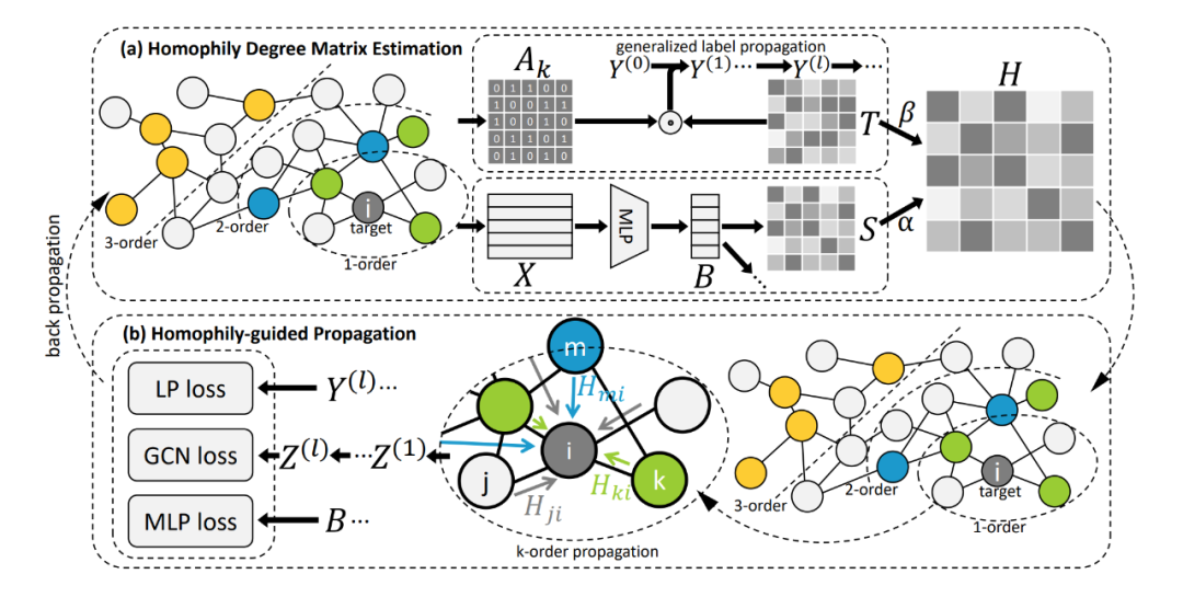 整个框架由同质度矩阵估计和同质度引导传播两部分组成。第一个组件包含 MLP 和广义标签传播。通过给出了 MLP 和广义标签传播的目标函数(前文已给出)。