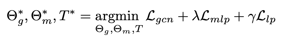 在该模型中,在传播过程中从属性和拓扑信息中学习同质度矩阵,并进一步用于进行特征传播。反过来,传播过程可以帮助更好地学习同质性度矩阵。也就是说,这两个组成部分相互增强。因此,我们将这些目标结合起来,以端到端的方式训练整个过程: