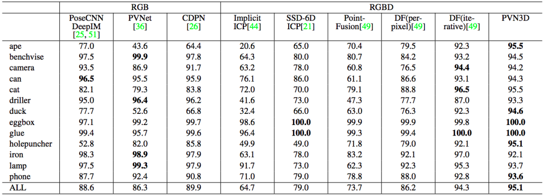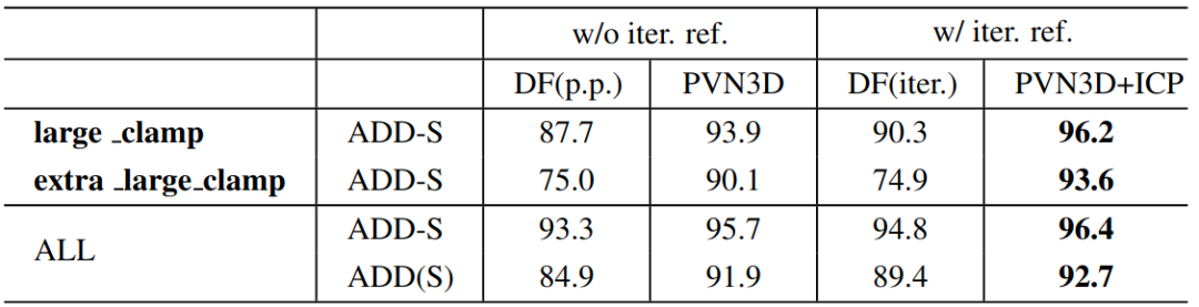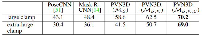 表 2 给出使用 ground truth 分割的评估结果,PVN3D 依然取得最佳性能。
