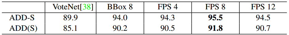 表 5 对比了不同关键点选择方式以及关键点数目对性能的影响,可见使用FPS算法选择的关键点优于3D检测框的8个角点,并且预测8个关键点是网络输出空间大小和最小二乘拟合位姿参数误差的一个较好的平衡。